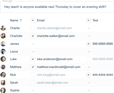 Sending updates to groups of employees is easy with our batch "Send a message" feature. In just two clicks, you can broadcast emails, texts, and push notifications to all of your employees.