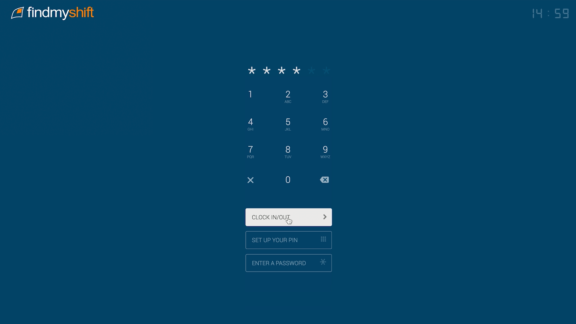 Employees can clock in and out with a PIN, or with the same password they use to access the website.